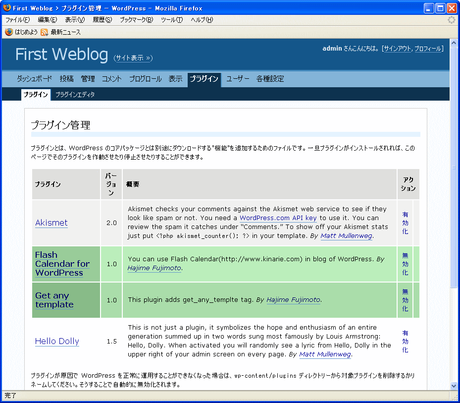 そして、WordPressにログインし、「Get any template」および「Flash Calendar for WordPress」のプラグインを有効化します。