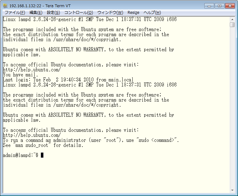 例えば、LAMPdのIPアドレスが「192.168.1.131」の場合だと、「ssh admin@192.168.1.131」と入力します。
