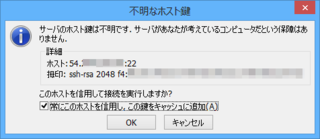 「常にこのホスト鍵を信用し、この鍵をキャッシュに追加」のチェックをオンにして、「OK」ボタンをクリックします。