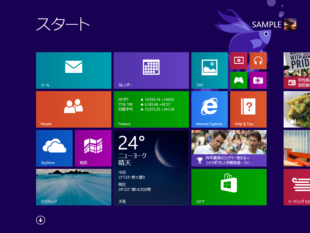 一方のWindows 8.1では、スタート画面の左下に「↓」のアイコンが表示され、それをクリックするとアプリ一覧の画面に移動することができます。 - タイルサイズの変更